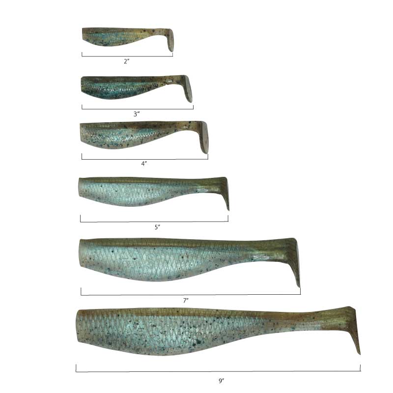 9" Bad Bubba Shad: Quantity: 1 per bag Suggested Rigs&Head Sizes: 1 oz to 8oz triangle jighead Suggested Line Rating-For Mono, Braid will vary: 20-40lb, 65lb Braid |