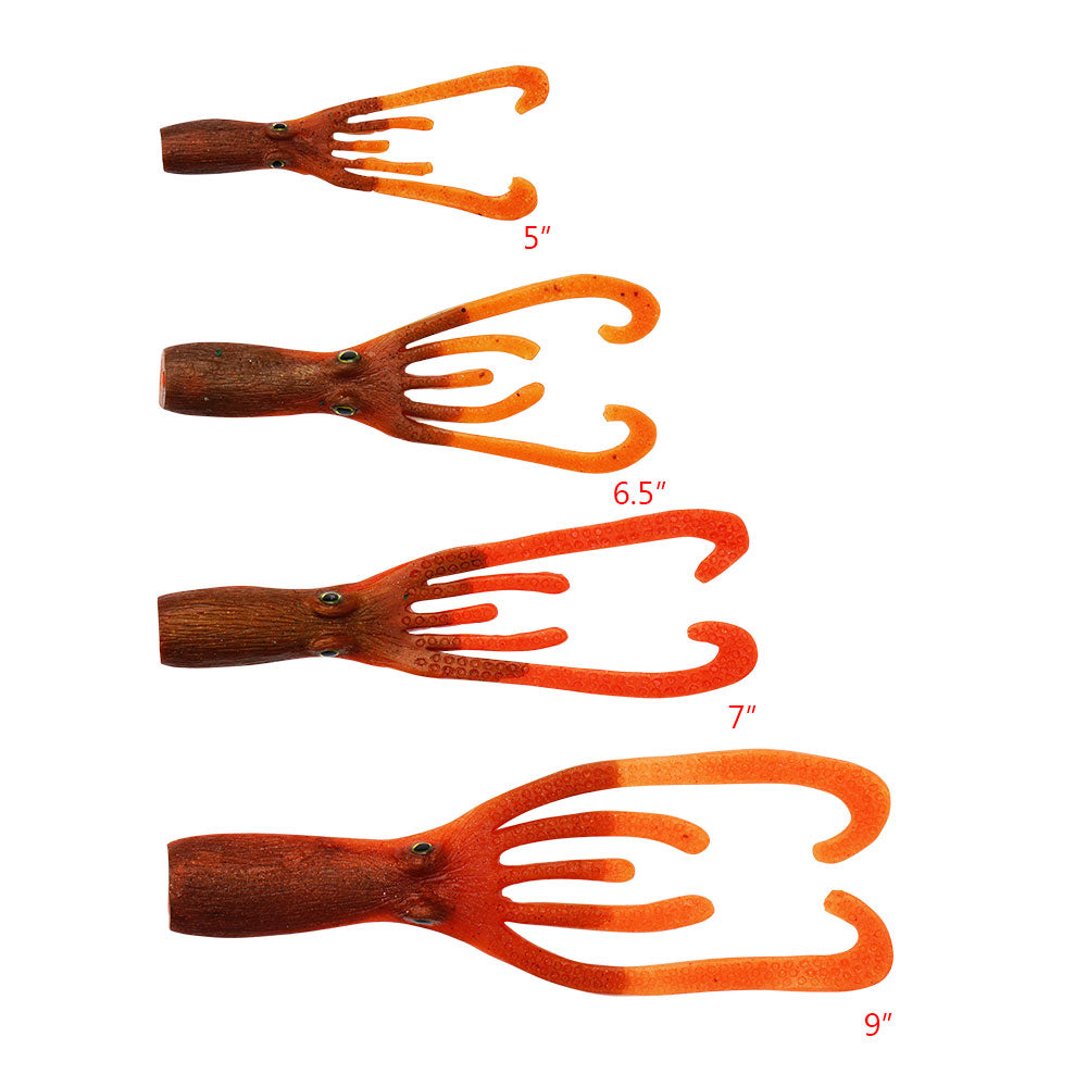 5" Magnum Octopus Quantity: 3 per bag Suggested Rigs&Head Sizes: 1/2oz to 2oz round or football jighead Suggested Line Rating-For Mono, Braid will vary: 14 - 30lb, 65lb Braid for bottomfishing |