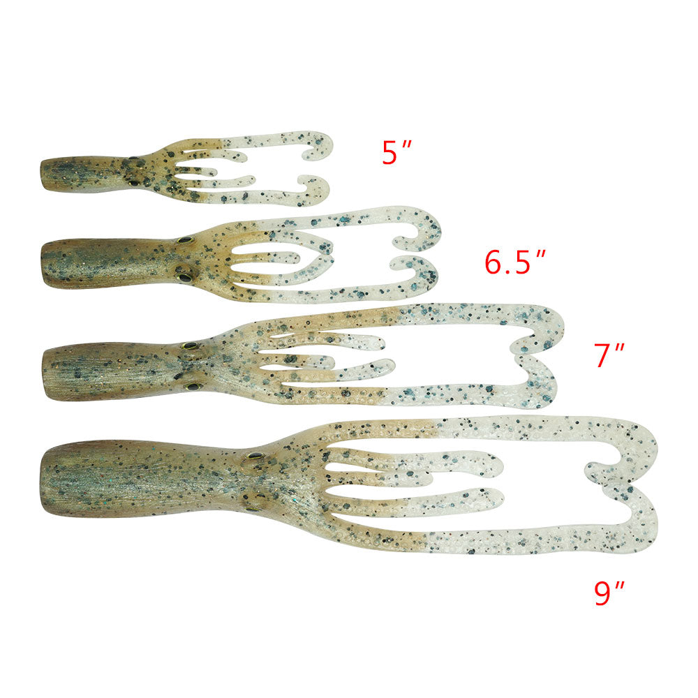 6.5" Magnum Octopus Quantity: 2 per bag Suggested Rigs&Head Sizes: 1oz to 3oz round or football jighead Suggested Line Rating-For Mono, Braid will vary: 17 - 30lb, 65lb Braid for bottomfishing |
