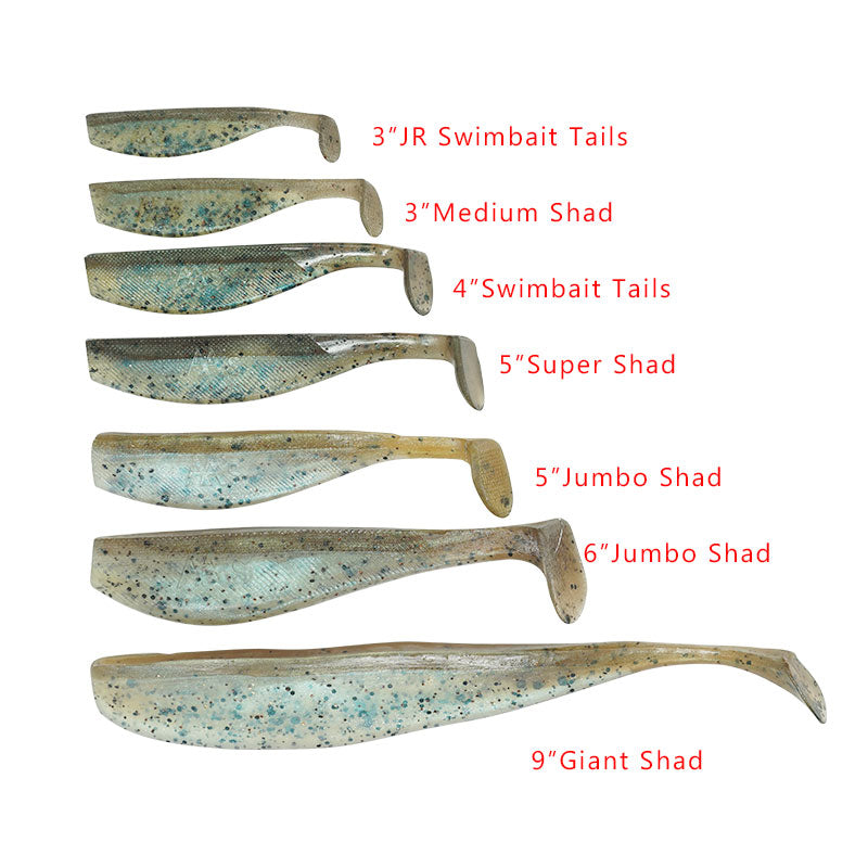 3" JR Swimbait Tails Quantity: 5 per bag Suggested Rigs&Head Sizes: 3/16 to 5/16 oz round or triangle jighead Suggested Line Rating-For Mono, Braid will vary: 4 - 8lb |